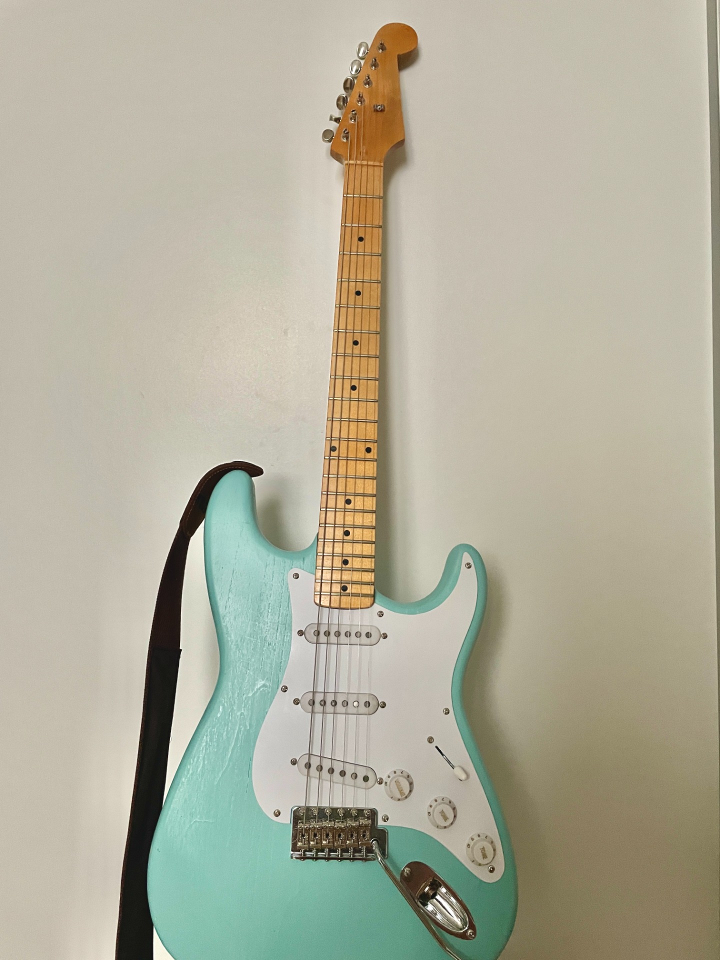 Toen ik net begonnen was met de gitaarlessen in 2024 heb ik besloten met de eerste opbrengsten een gitaar te bouwen. De Hals achteraan naar een '57 V-profiel en de lak Daphne Blue zoals de gitaar toen bij Bax.