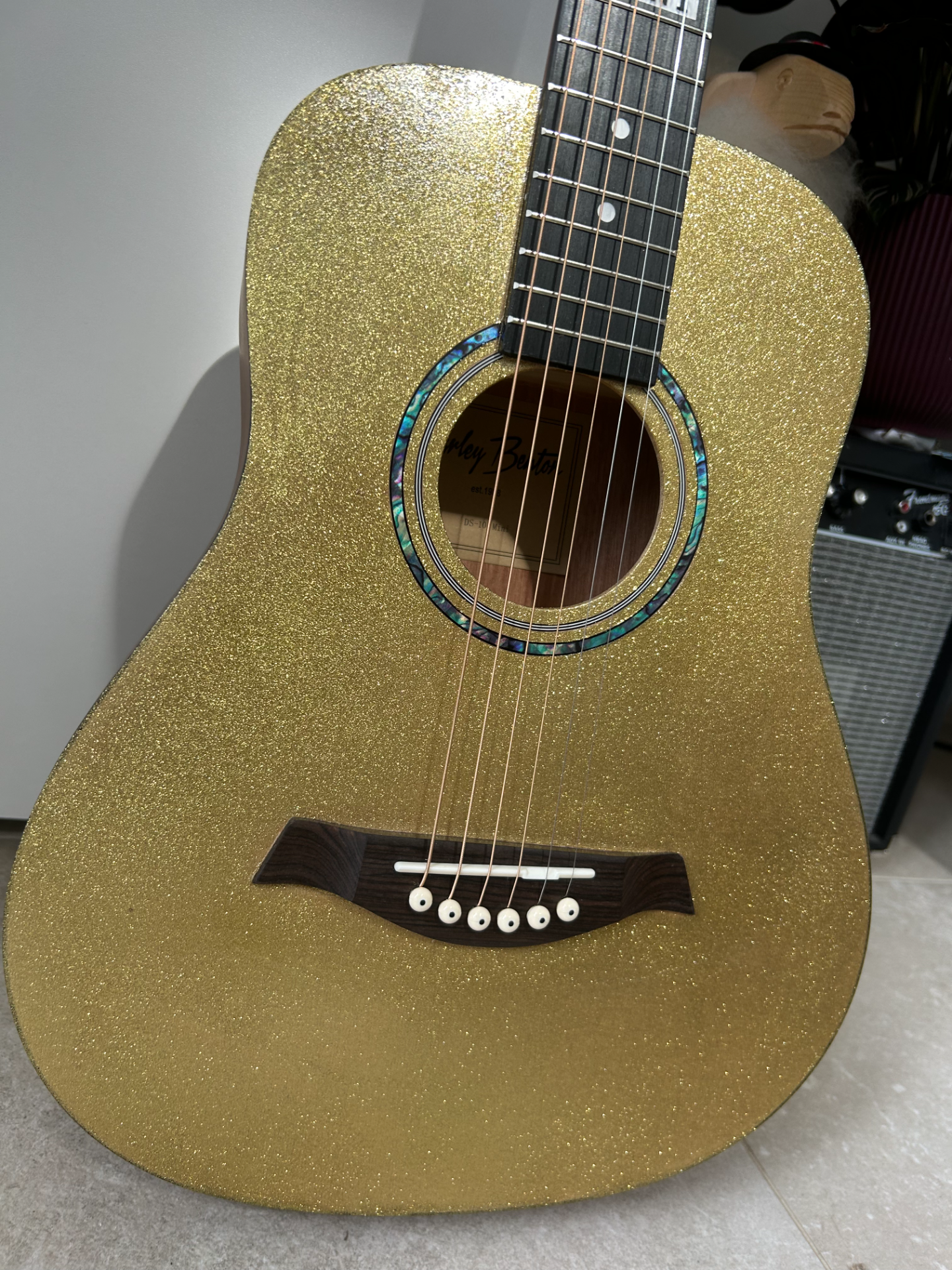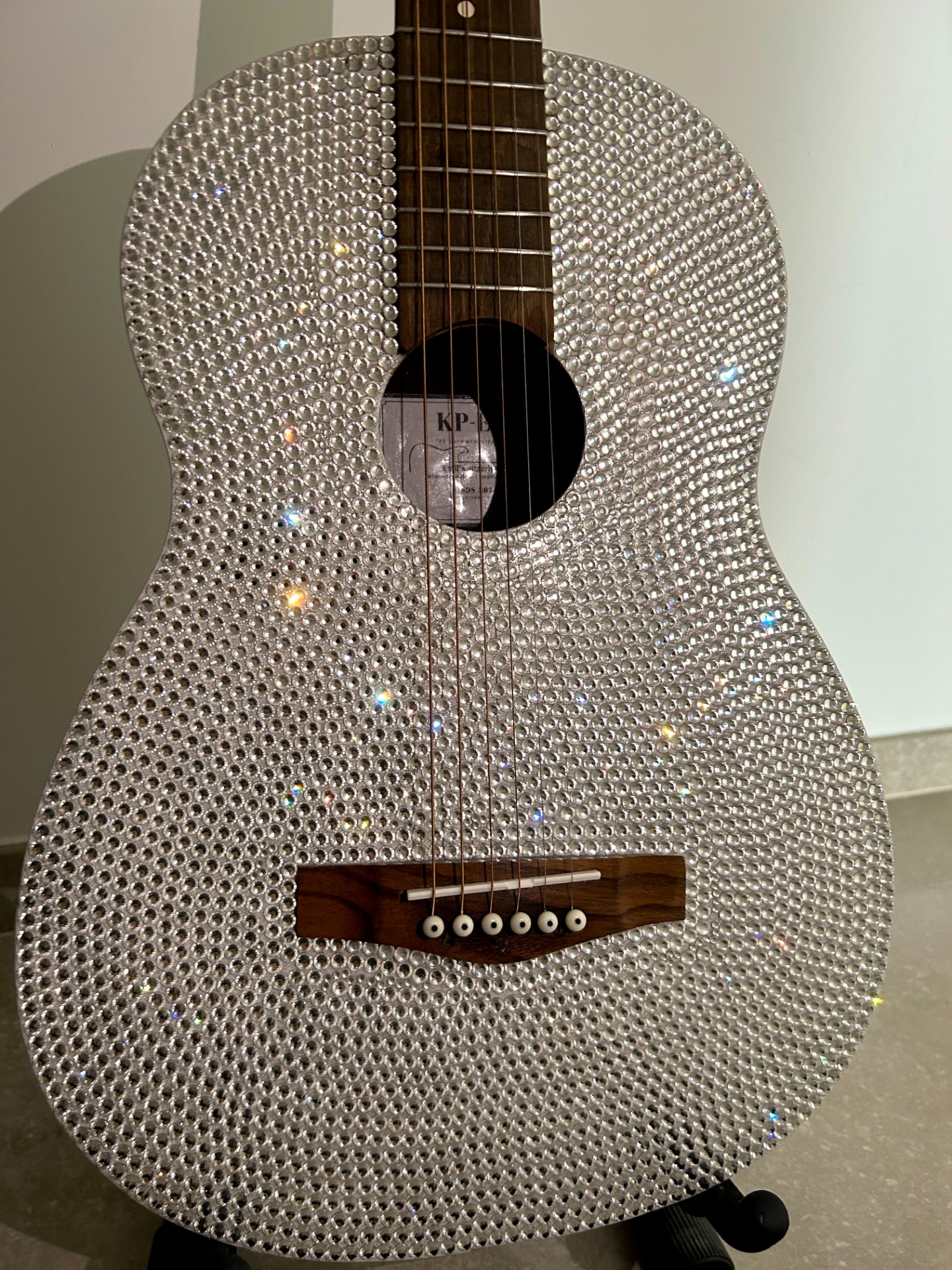 De Shimmer gitaar is geïnspireerd op Taylor Swift's Fearless gitaar. Een beeld dat vele Swifties bekend zal voorkomen. Wat ooit een eenvoudig bruine gitaar was, veranderde door lagen glitterverf en honderden zorgvuldig geplaatste steentjes in een sprankelend kunstwerk dat dagen werk vergde. Nu schittert ze als nooit tevoren.