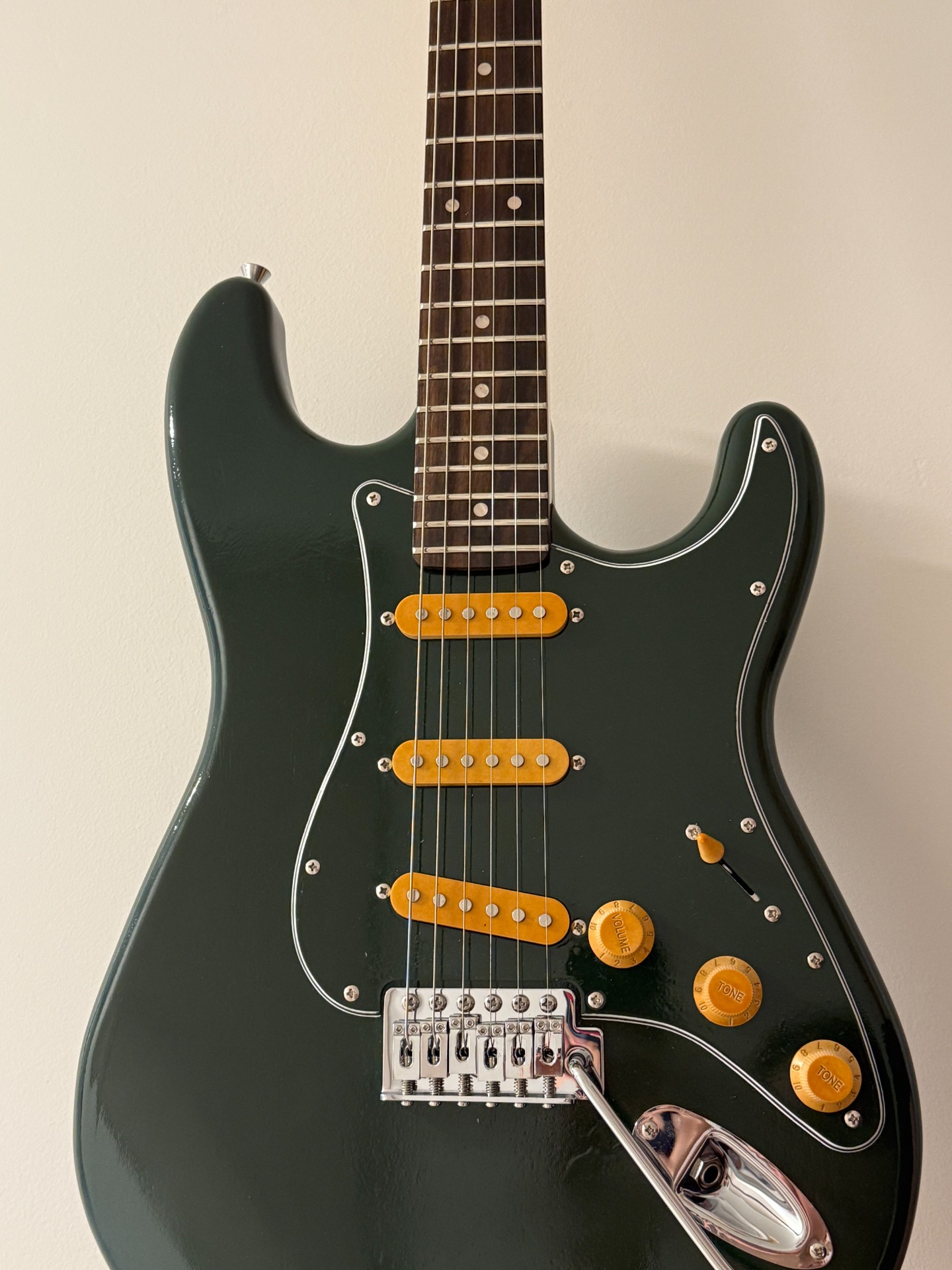 Een van onze meest trouwe volgers werd verliefd op de donkergroene kleur van 'De Ivy Strat'. Hij vroeg aan ons om deze gitaar nogmaals te maken, maar deze keer zonder de klimop zodat ze volledig aansluit bij zijn visie. Jean is nu zeer gelukkig met zijn nieuwe Stratocaster.