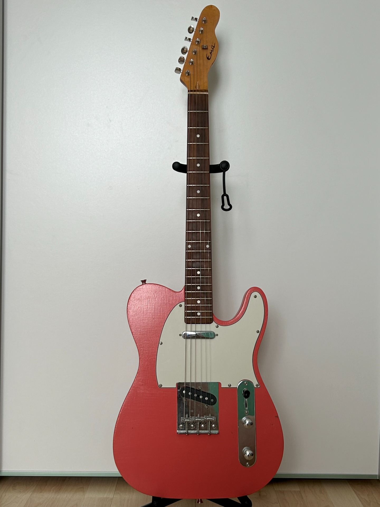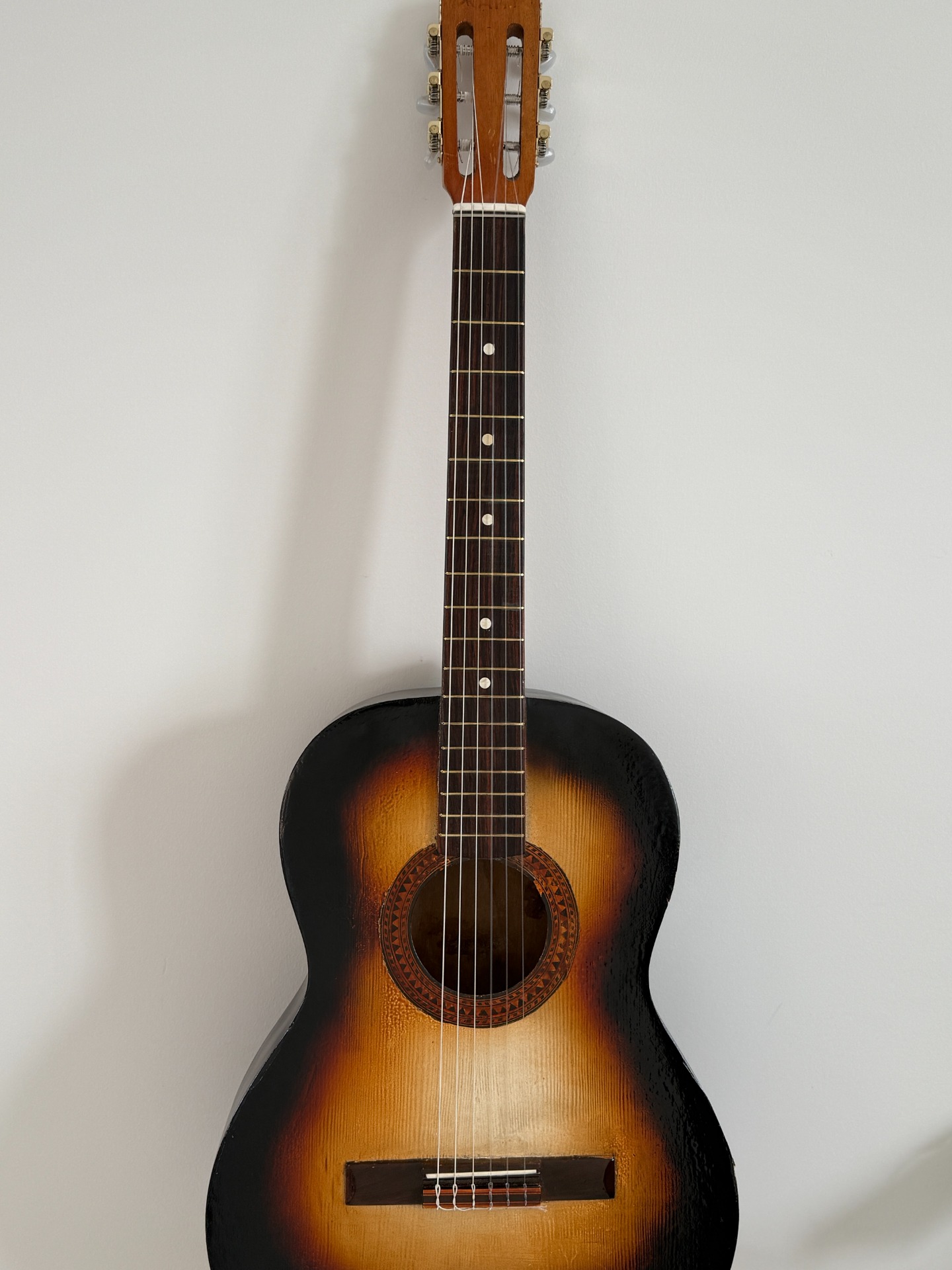 Eén van de twee klassieke gitaren waar ik graag op speel. Na een lang, niet altijd even mooi leven heb ik besloten de natuur lak van deze gitaar te veranderen. De vele oneffenheden, barsten en deuken maakten het niet mogelijk om er nog iets gelijkaardigs van te maken. Dan maar de eerste sunburst ooit geprobeerd te spuiten, redelijk gelukkig met de outcome.