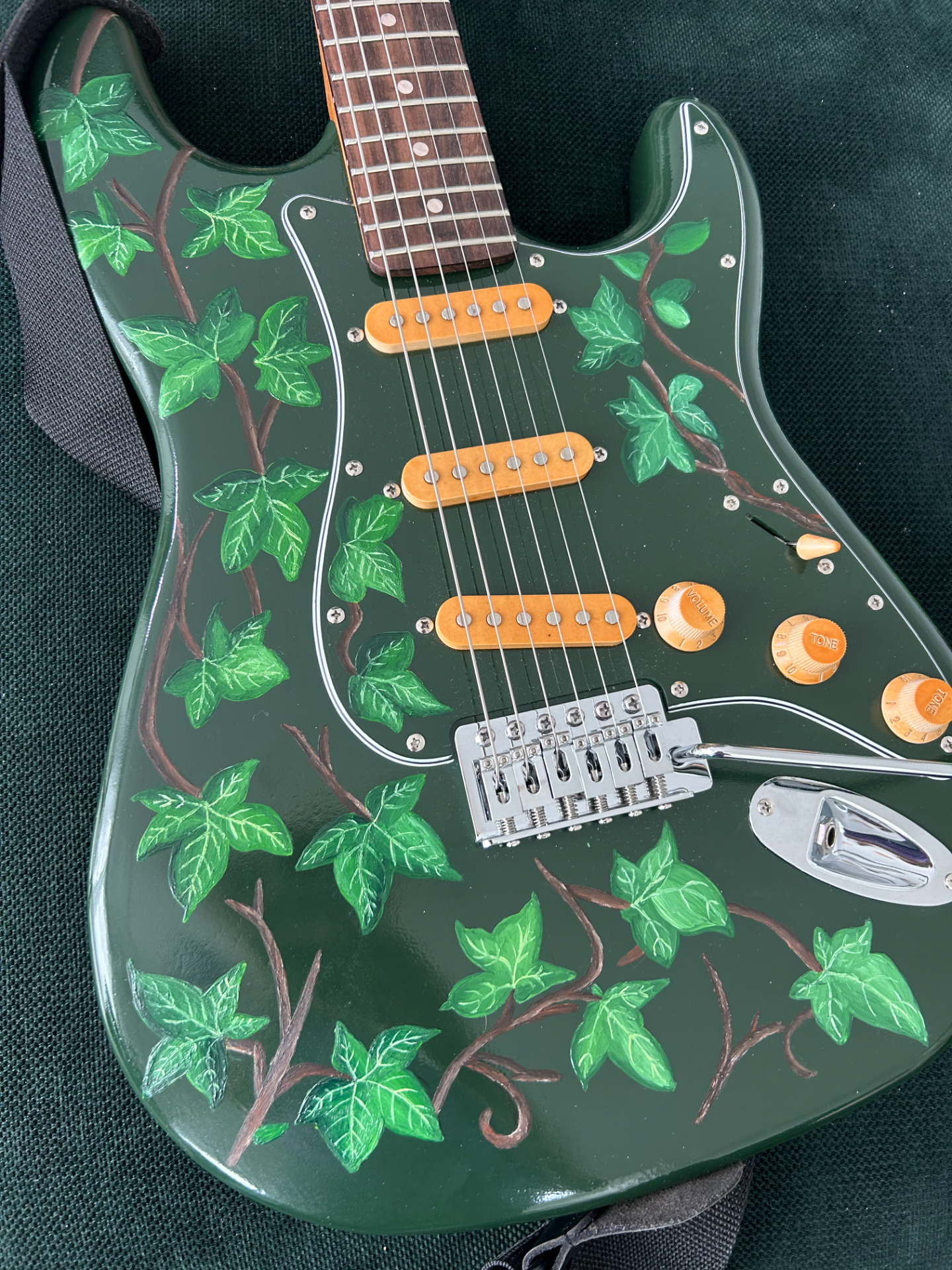Duister donkergroen vormt de basis voor deze Statocaster. De klimop geeft het geheel een mysterieuze, bijna betoverende uitstraling. Een subtiele knipoog naar het nummer Ivy op het album Evermore (Taylor Swift), waar natuur en emotie verstrengeld raken.